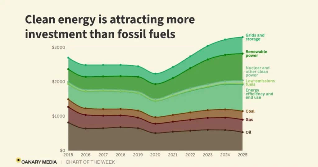 In 2024, solar energy alone provided more new electricity than any other source, doubling generation in just three years. According to the IEA’s World Energy Investment 2025[13], clean energy now attracts twice as much investment as fossil fuels worldwide, signalling that the centre of gravity in the energy system has shifted permanently.